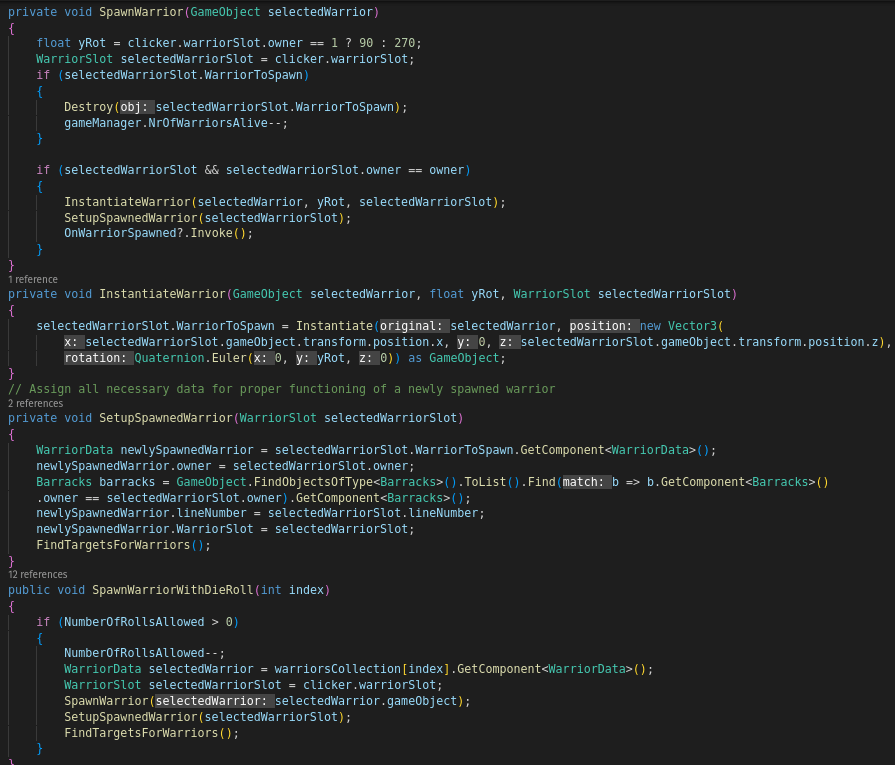 As a school assignment for a first part of a minor, me and my colleague introduced the first playable citadel siege prototype. For the second part of the minor, we had to change the game concept in a some way. This created a split of versions: the original citadel siege and citadel siege corporative edition. In the original version, there are 3 warrior slots on each combat line. Warrior is able to attack only the warrior of the opponent which was placed on the same slot (or on the adjacent to the same slot) on the same combat line but from the opposite side. In corporative edition there is only one warrior slot for each combat line. The difference is that on central slots instead of normal warriors you place a hero – basically a bigger and stronger version of its smaller brother/sister and player can pick buffs for the hero before the battle. Unlike in the original citadel siege where you needed to play multiple rounds to have a winner, there is only one round in corporative edition, making the player session shorter. Corporative edition also received a huge graphical boost, warriors got animated which impacted the combat system a lot. At the same time, corporative edition got rid of some important features, like mini-map and warrior upgrades for simplicity reasons.